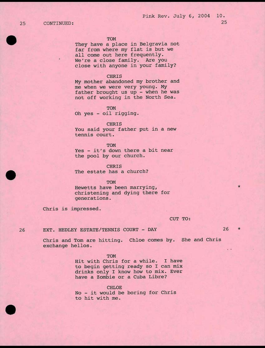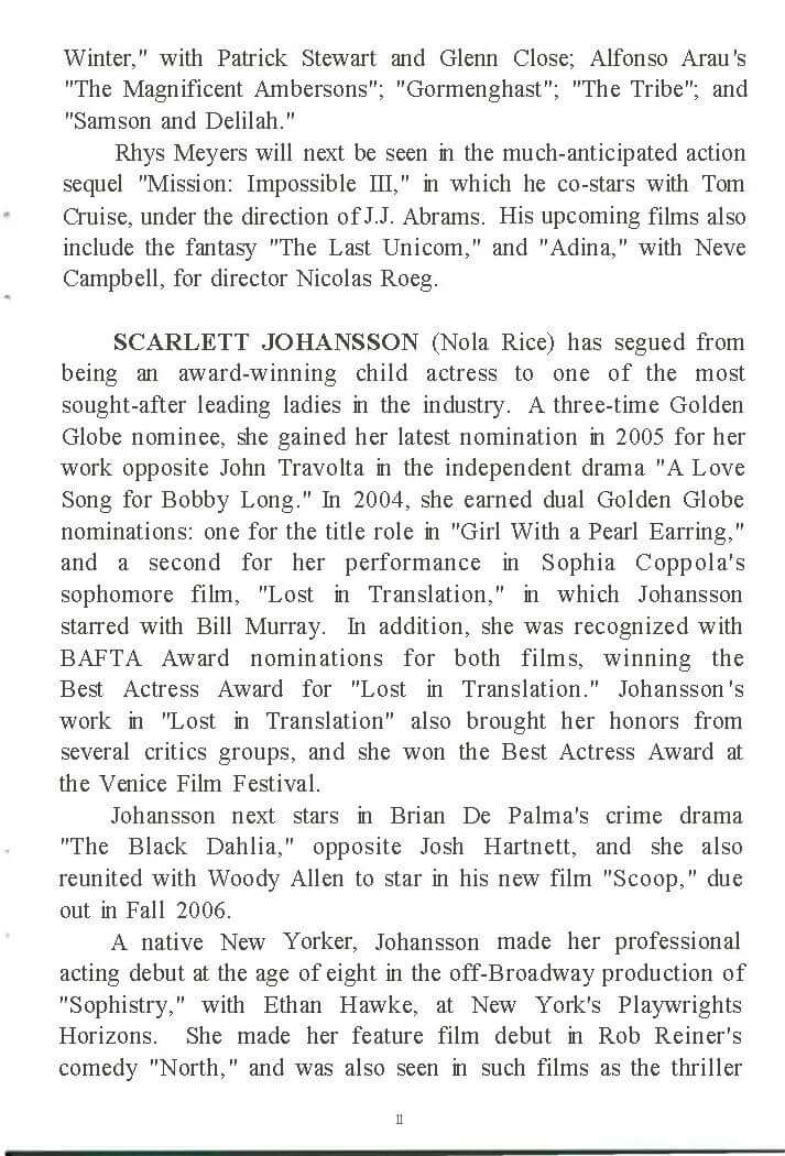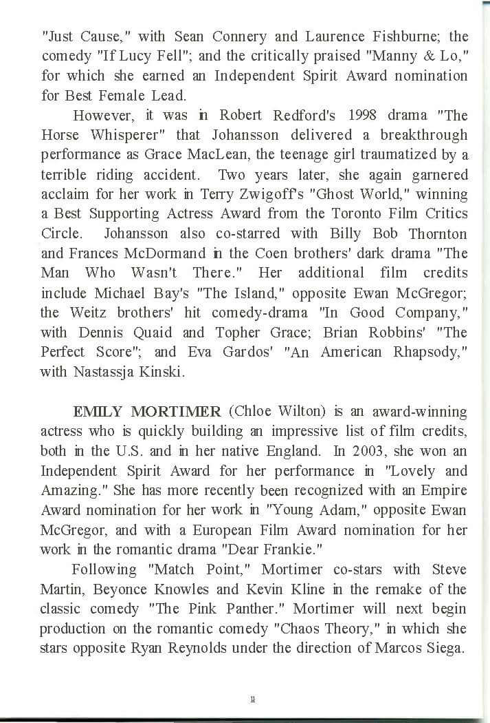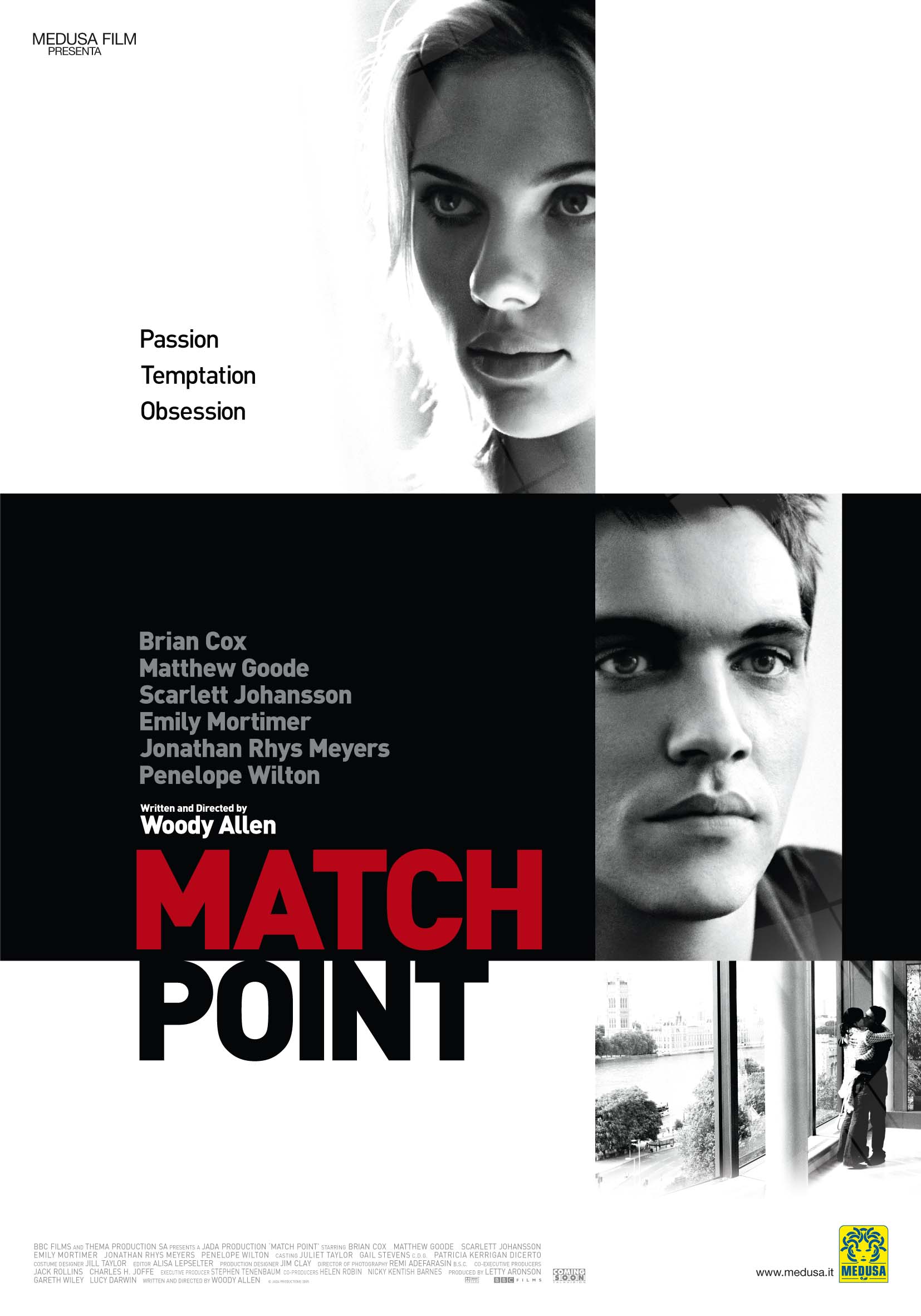 The film stars Jonathan Rhys Meyers (BEND IT LIKE BECKHAM, TV's ELVIS), Scarlett Johansson (LOST IN TRANSLATION, GIRL WITH A PEARL EARRING), Emily Mortimer (LOVELY AND AMAZING, DEAR FRANKIE), Matthew Goode (CHASING LIBERTY), Brian Cox (THE BOURNE IDENTITY, RED EYE) and Penelope Wilton (IRIS, PRIDE & PREJUDICE). Premiering to rave reviews at the 2005 Cannes Film Festival, MATCH POINT was produced by Letty Aronson, Gareth Wiley and Lucy Darwin. Stephen Tenenbaum served as the executive producer with Helen Robin and Nicky Kentish Barnes co-producing, and Jack Rollins and Charles H. Joffe co-executive producing. MATCH POINT will be distributed domestically by DreamWorks.