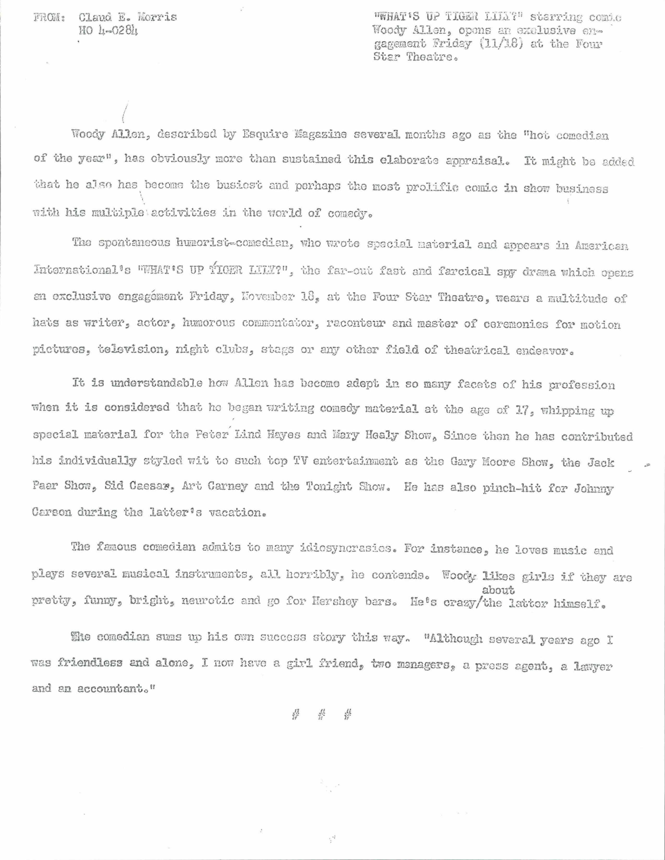 "WHAT'S UP, TIGER LILY?" is a 1966 American comedy film directed by Woody Allen in his feature-length directorial debut.