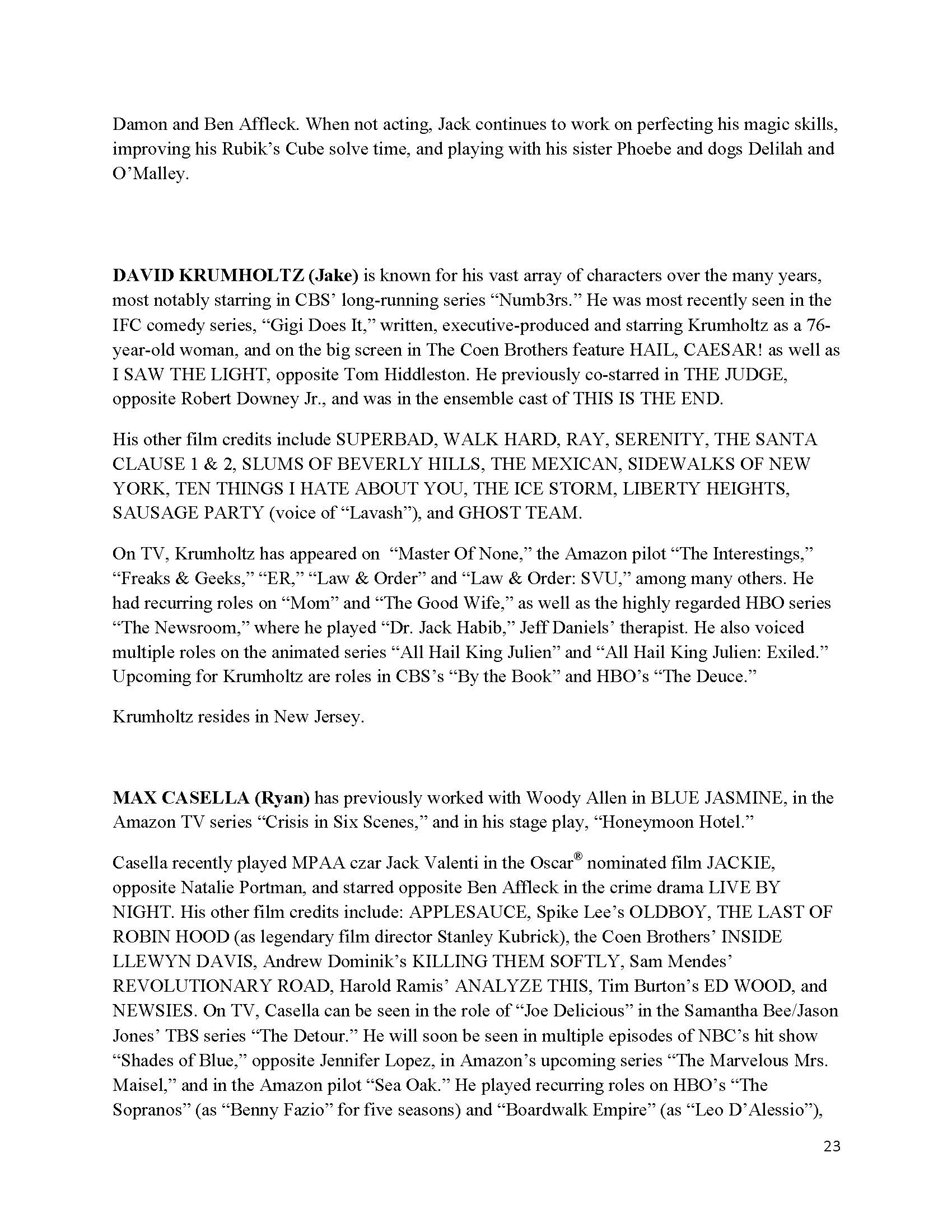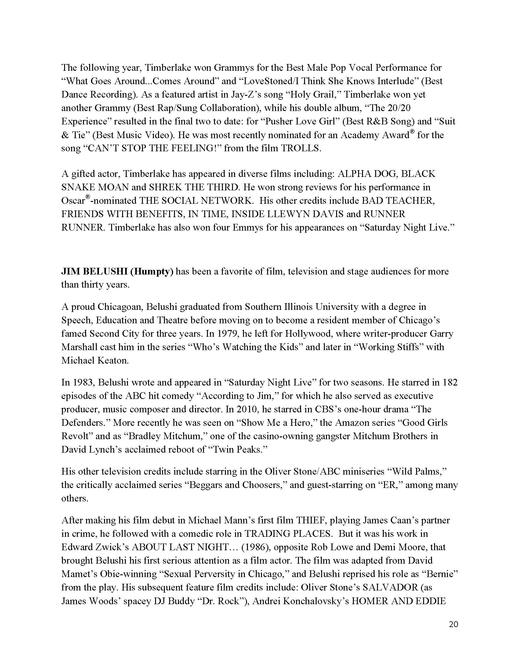 Allen first noticed Jim Belushi in Ed Zwick’s 1986 film ABOUT LAST NIGHT... “At the time I said, ‘Who is that guy?’” says Allen. “‘He’s an extremely good actor, as strong as can be on the screen and he’s touching. I said, ‘Maybe someday I’ll give him a call.’ Now we cut to thirty years later and I’m thinking, ‘Who would be perfect for Humpty?’ and asked him to come in. I could tell after five minutes with him, that he would make a wonderful Humpty. I think he will surprise a lot of people with this. I think they’re going to be surprised at what a tremendous actor he is, so full of emotion, full of reality and full of feeling.” Says Belushi: “Woody gives you a lot of...