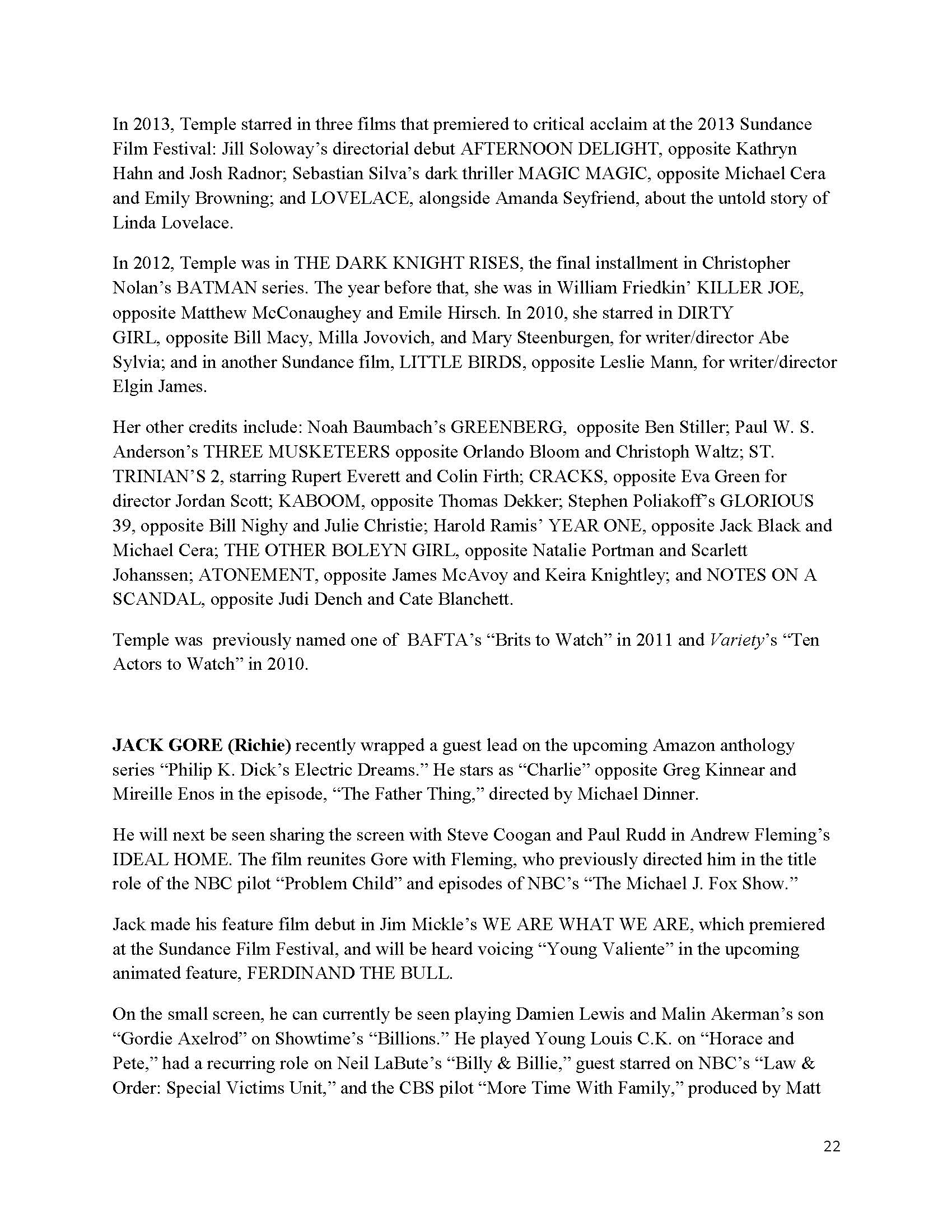 The couple’s routine is broken by the unexpected arrival of Humpty’s daughter Carolina (Juno Temple), who Humpty hasn’t seen or spoken to in five years. “Carolina was a girl who was, by the local standards, very beautiful,” says Allen. “At some point, a local hoodlum made a play for her and took her to places where the local boys couldn’t take her, and bought her furs and jewels. She was seduced by the glamour and they end up getting married. For a while they have a nice time together, but eventually things started to get more contentious in the marriage, and they broke up. Soon after, the FBI got to her and threatened her, so she told them some things about her ex-husband’s business. At this point, she becomes a...