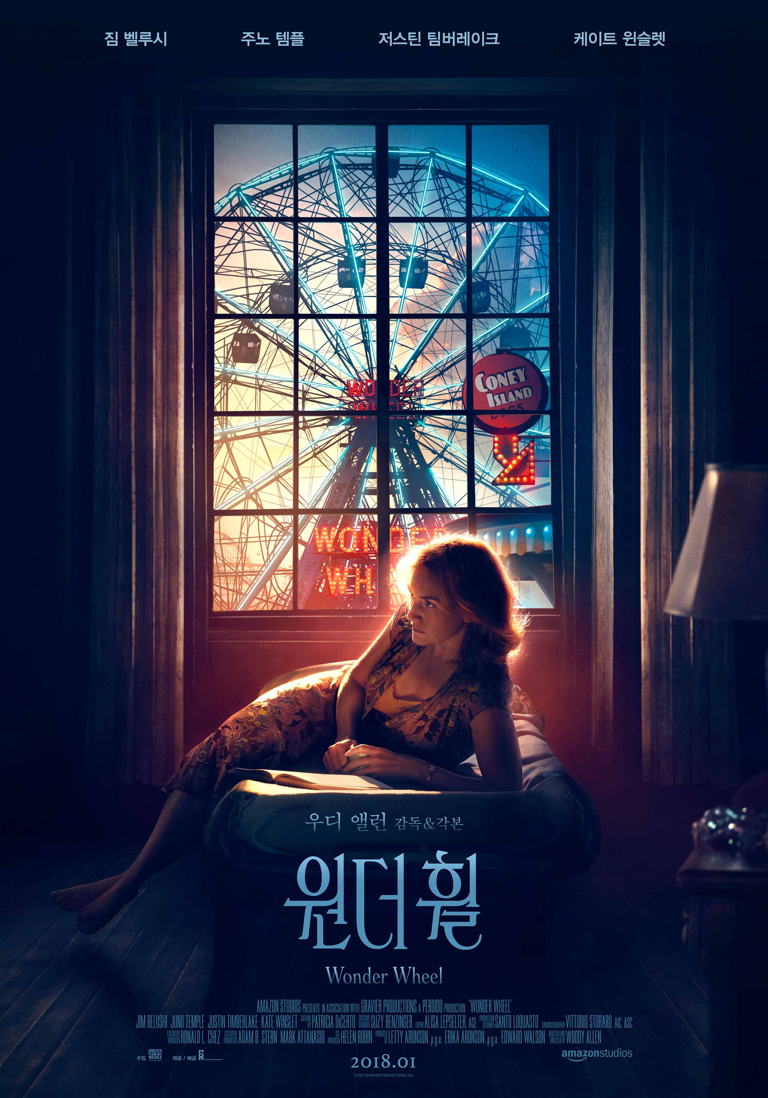 WONDER WHEEL tells the story of four characters whose lives intertwine amid the hustle and bustle of the Coney Island amusement park in the 1950s: Ginny (Kate Winslet), a melancholy, emotionally volatile former actress now working as a waitress in a clam house; Humpty (Jim Belushi), Ginny’s rough-hewn carousel operator husband; Mickey (Justin Timberlake), a handsome young lifeguard who dreams of becoming a playwright; and Carolina (Juno Temple), Humpty’s long-estranged daughter, who is now hiding out from gangsters at her father’s apartment.